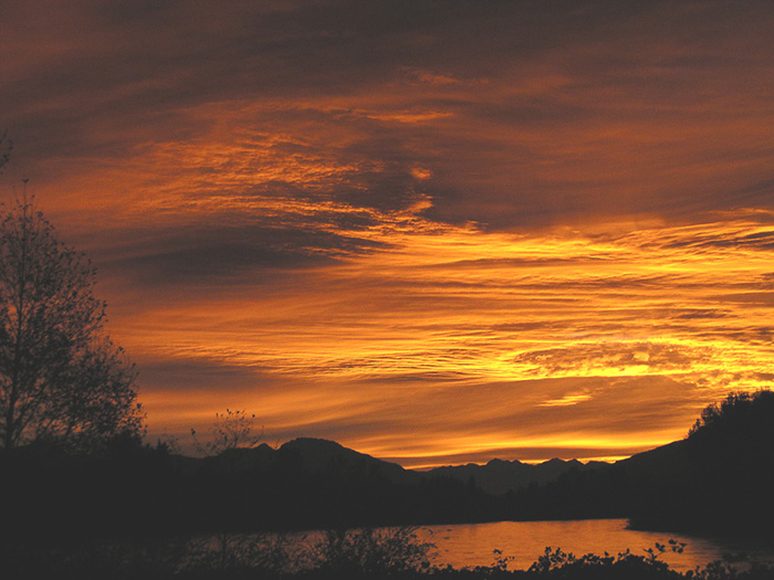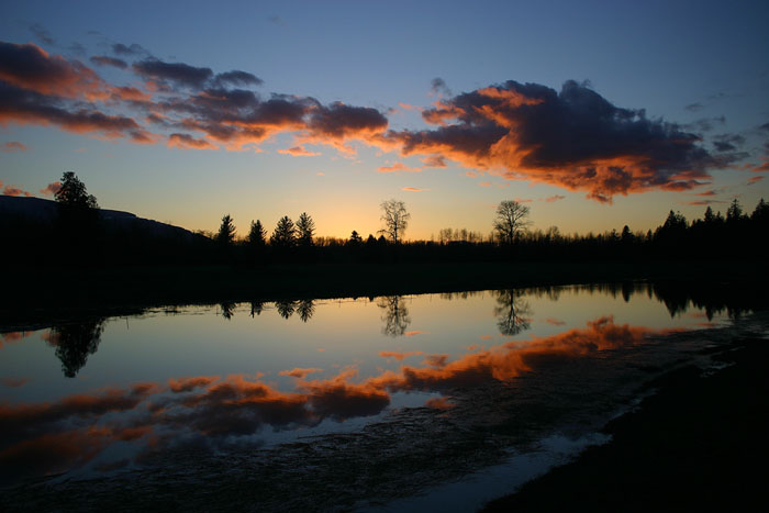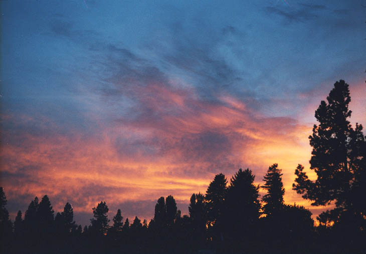 Photo of this morning's (Oct 18, 2003) sunrise over the Skagit River in northwest Washington State, USA. Taken with an Olympus C-730 Ultra Zoom digital camera, and underexposed 1.3 stops from the metered reading.e-mail to: Wade B Clark Jr |