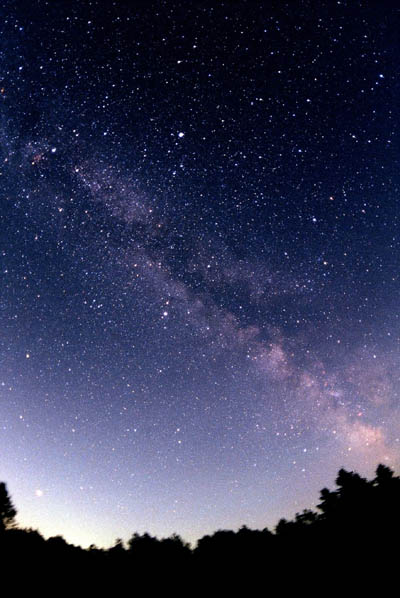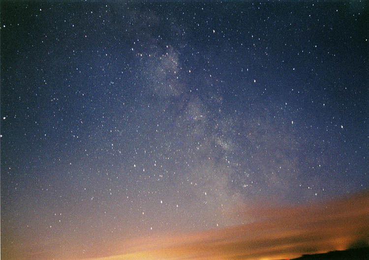 The Milky Way taken at the Mont Cosmos observatory on June 21 2003. Pro Via 400 film and a Nikon FE and a Pelling 8mm Fisheye lens. Exposed 5 minutes Philippe Moussette - Quebec, Canada See more photos at: http://www.geocities.com/photo_geo/ or at: ftp://ftp.quebectel.com/astroccd/moup/ |