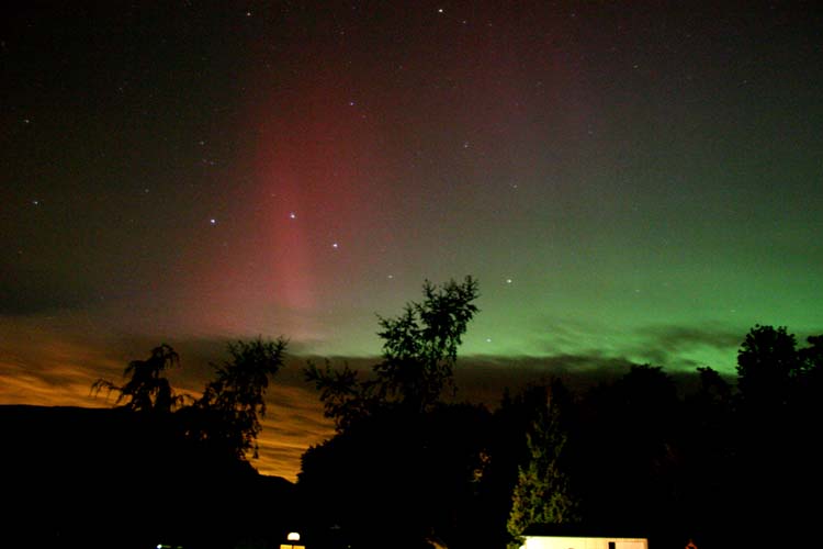 Aurora display, November 7, 2004, taken from my backyard on my 47th birthday!! What a perfect gift <grin>!Looking southeast at Orion and the aurora.