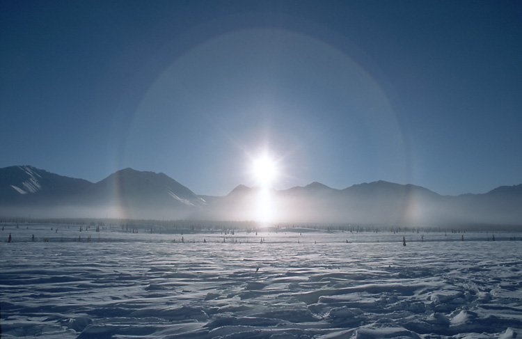 I took this photo April 8, 2003 on the the frozen Knik River near Palmer, Alaska. This photo reminds me of those illustrations of alien planets that you see in science fiction books and magazines. I used a Canon EOS 10D set at ISO 800. Although the moon was actually only falf full, the 8 second exposure makes it look full.e-mail to: Scott McGee |