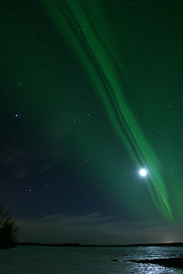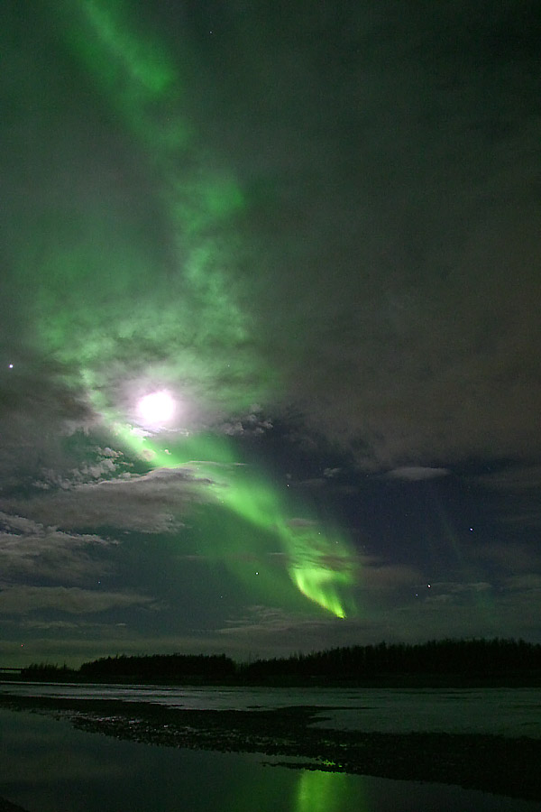 I took this photograph April 10 at the Knik River near Palmer, Alaska. This was a very intense burst that lasted approximately 10 minutes. As you can see, the approaching clouds and the nearly full moon could not hide the lights. I think the illumination of the clouds by the moon, and the reflection of the aurora in the Knik River, makes this photo especially unusual and pleasing.See more photos by: Scott McGee |