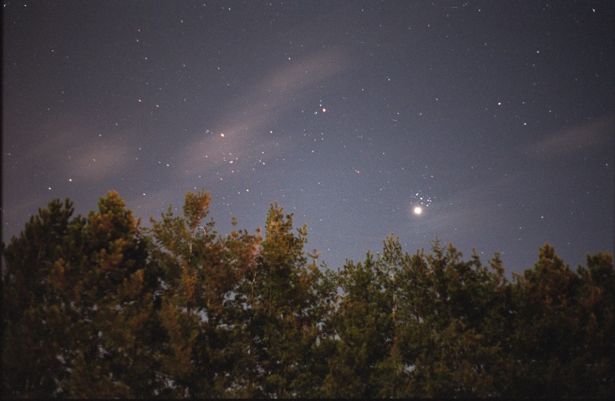 On the night of April 2, 2004, the moon made a guest appearance with the Pleiades, while the planet Mars watched from above. Pentax K1000, 50mm f/2, 14 sec. on fuji 400 film.e-mail to: William Biscorner - Memphis, Michigan |