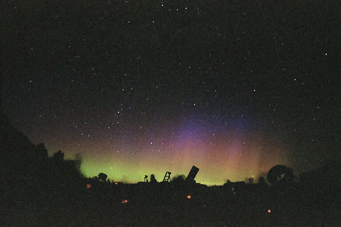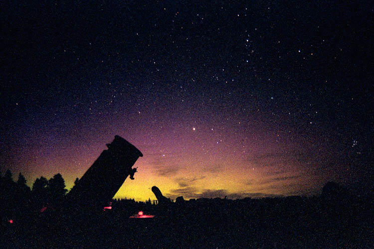 6-17-03-021.jpg (36930 bytes)The aurora oval surrounding the earth will sometimes be pushed far enough south to see dark sky to the north beyond the glow, even "down here" at 47 degrees latitude. This photo looking towards Mt. Spokane, shows some dark sky to the north beyond the auroral ring.       024.jpg (61576 bytes)Aurora from the Table Mountain Star Party in 2003. This was the first moments of the show. The blues were barley visible to the eye but show up well on film. This photo was taken on Kodak Max 400 film and a 25 second exposure.