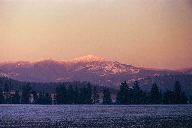 comet029.jpg (79026 bytes) Comet Ikeya-Zhang passing above the Andromeda galaxy on April 4th, 2002. Photo was taken with a Minolta X-700 camera and 200 mm zoom lens on 400 speed film . This was a 5 minute guided exposure taken north of  Spokane Washington  018.jpg (53048 bytes) A late December sunset over Mount Spokane and the surrounding foothills turns the mountains pink on one of our rare cloudless days during winter in the Pacific Northwest. The Idaho panhandle is just beyond