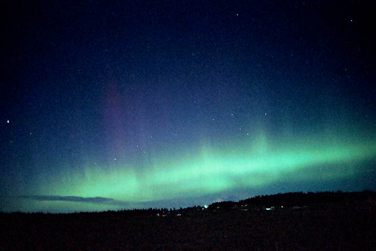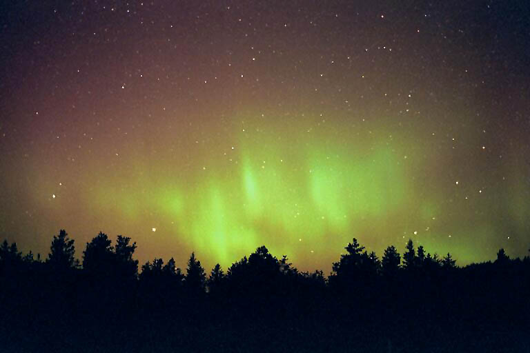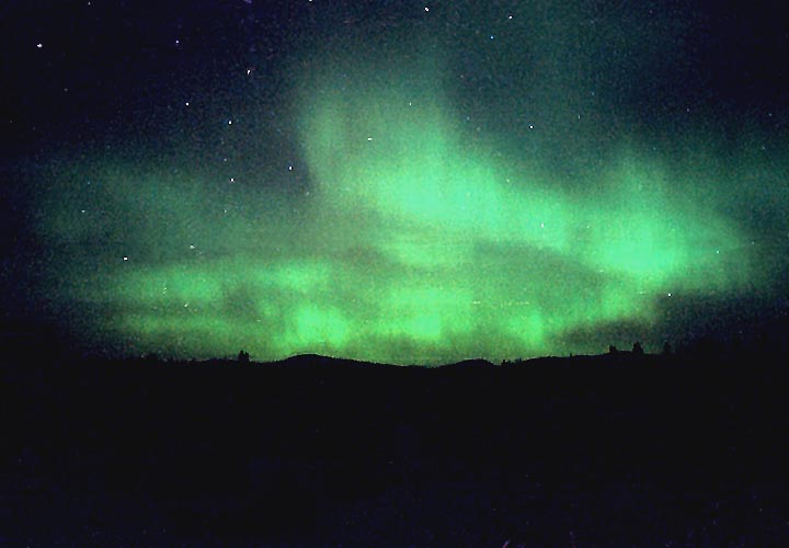 home 004 copy.jpg (35073 bytes)What your eye sees as mostly a faint greenish glow, the camera sees in living color. Photographing faint horizon hugging auroras can produce some surprisingly good photos.