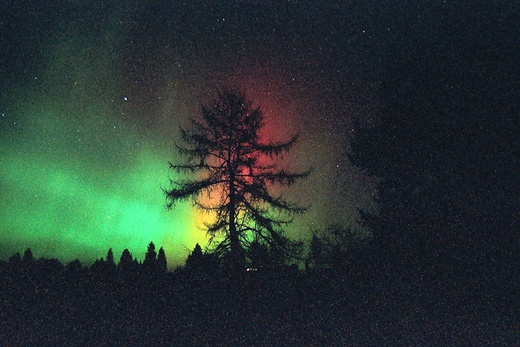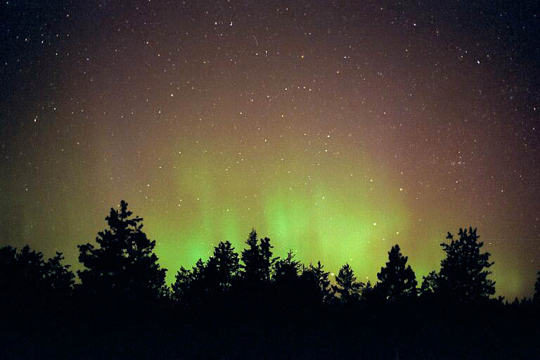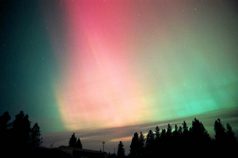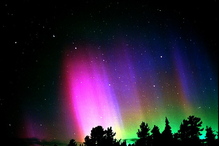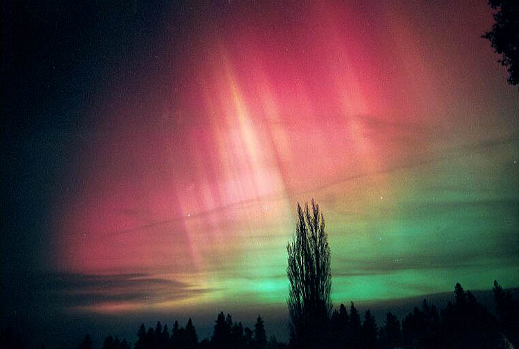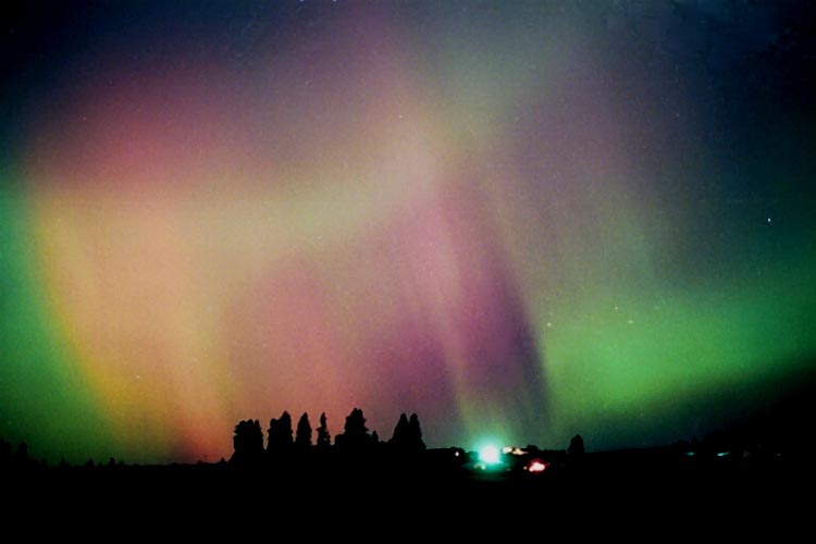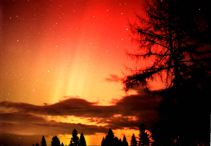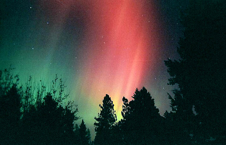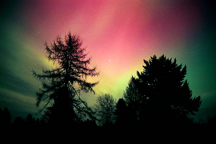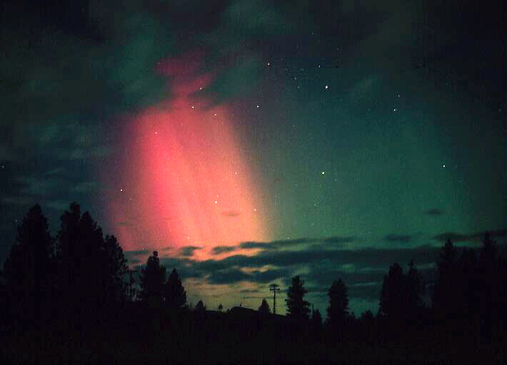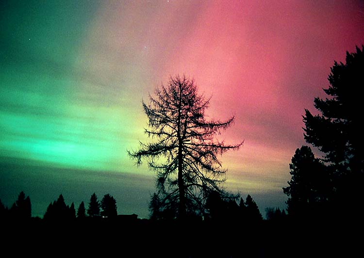015.-c-tif copy.jpg (39607 bytes)Fantastic colors light up the sky over Peone Prairie near Spokane on Oct 4th 2000. The energy released by this geomagnetic storm in an hour could have could have supplied all of North America for about two days.