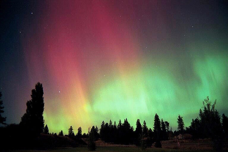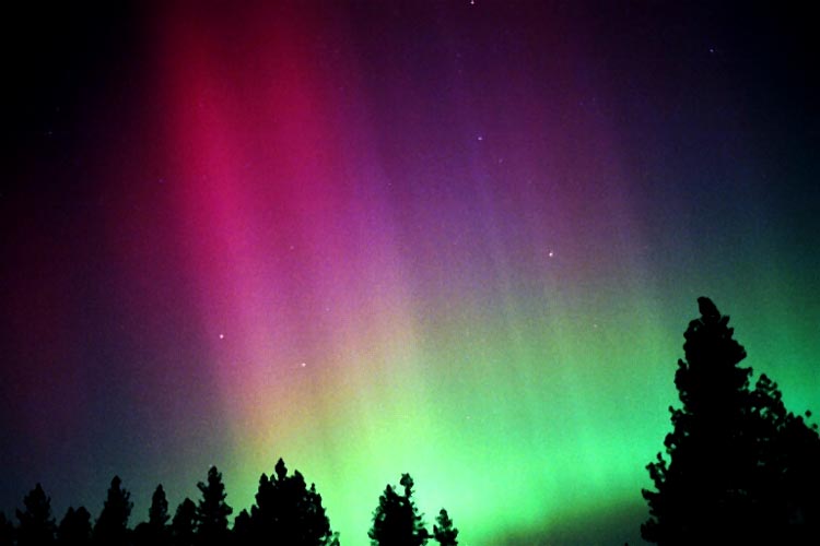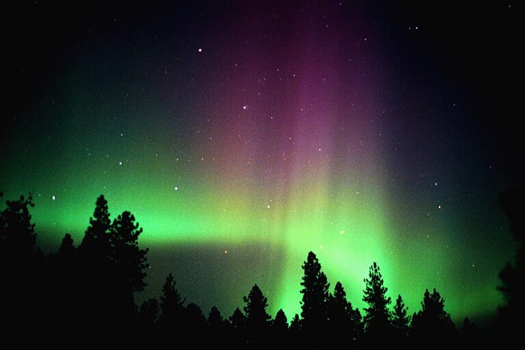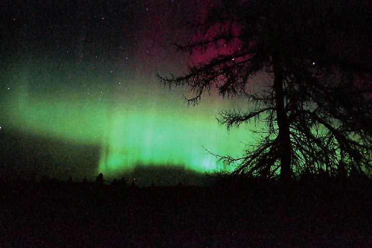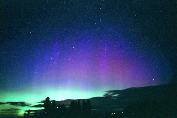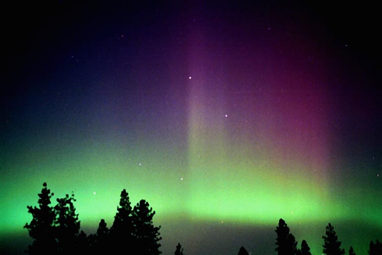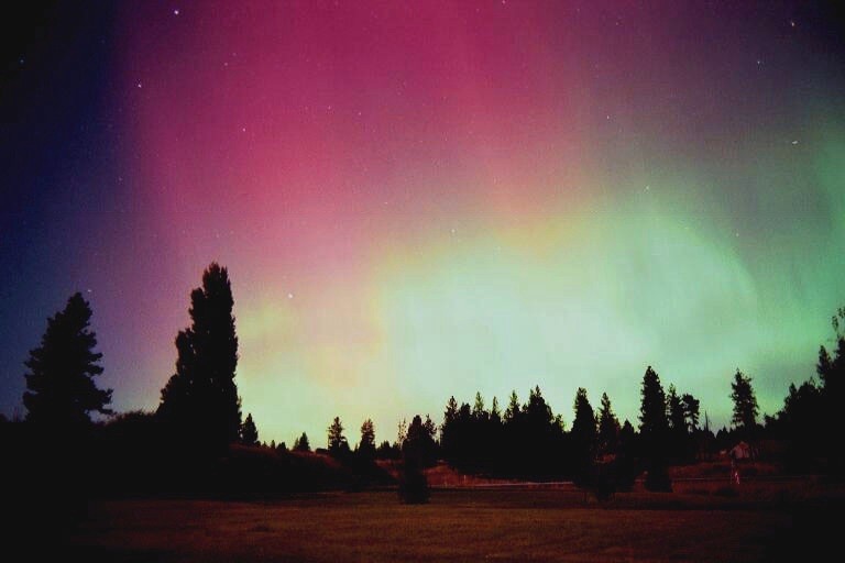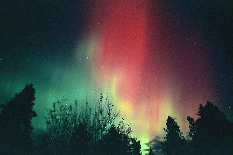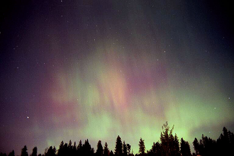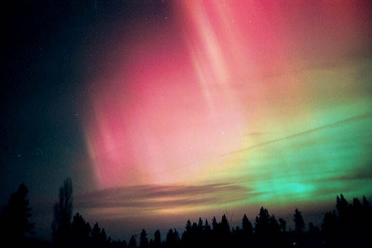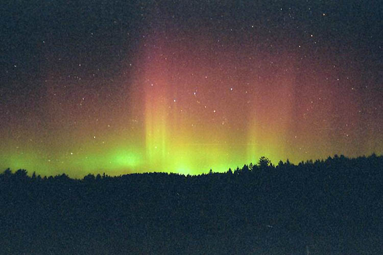 015.-c-tif copy.jpg (39607 bytes)Fantastic colors light up the sky over Peone Prairie near Spokane on Oct 4th 2000. The energy released by this geomagnetic storm in an hour could have could have supplied all of North America for about two days.
