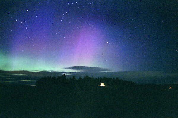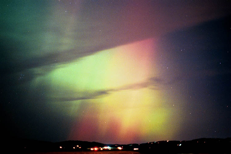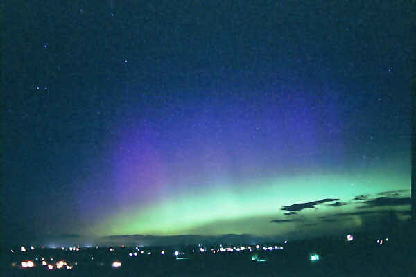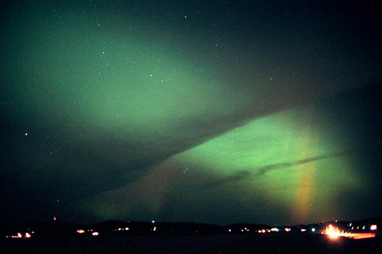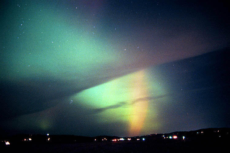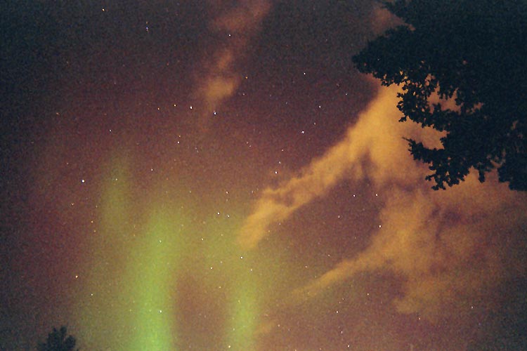 4-11-01-pict5-copy.jpg (65822 bytes) An aurora on April 11, 2001, combined with passing clouds to create an unusual scene in the sky before fading. A 20 second exposures taken on Kodak Max 400.