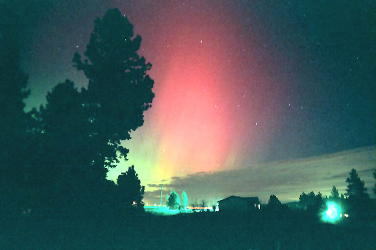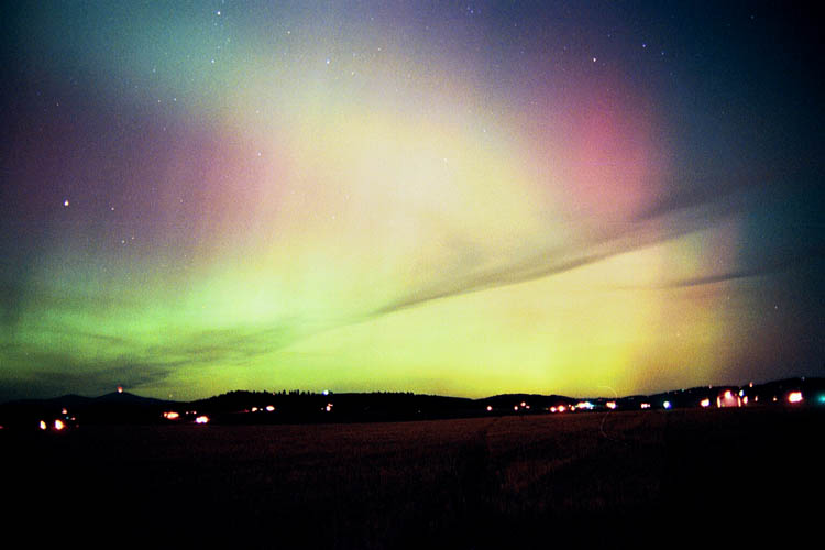 10-01-02-039.jpg (58473 bytes)This photo was taken looking to the northeast over Mount Spokane in the distance. Pillars began appearing in the dome of color that spanned the north horizon from east to west. Camera was a Minolta X700 with a 28mm lens at f 2.8 on Kodak Maxx 400 film. 10-01-02