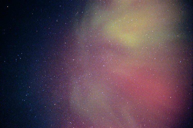 5-12-02-023 copy.jpg (58238 bytes)For nearly two hours the north horizon looked like a strange sort of forest fire was burning in the night. These faint displays go unnoticed by most people and are lost in the glow of city lights. This was taken 35 miles north of Spokane on a moonless night.  May 12th, 2002