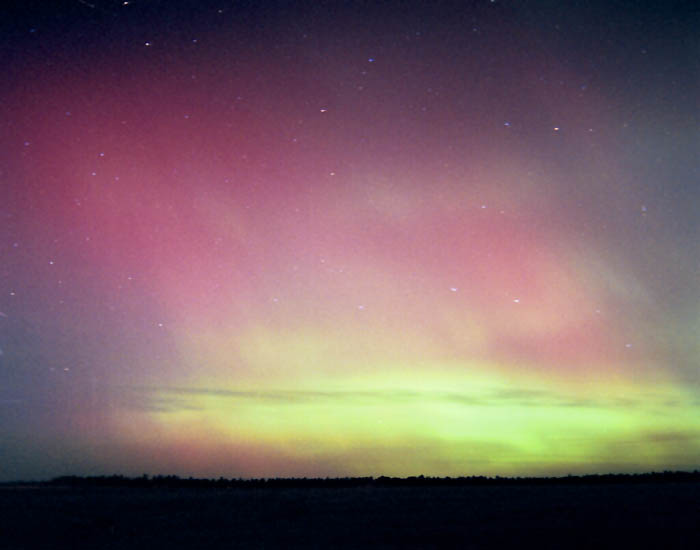 5-14-02-003 copy.jpg (50019 bytes)I could only see the faintest trace of color and thought I might be imagining it when I took this photo. The camera sees all. Taken from a hill top near Colbert Washington at 1 am pdt. May 14th, 2002