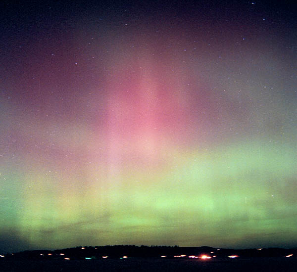 home 008 copy.jpg (34468 bytes)This short but colorful bust of aurora occurred in the late night hours of Oct. 3rd 2000. This 15 second exposure was taken with a 50 mm lens on Kodak Max 400 film.