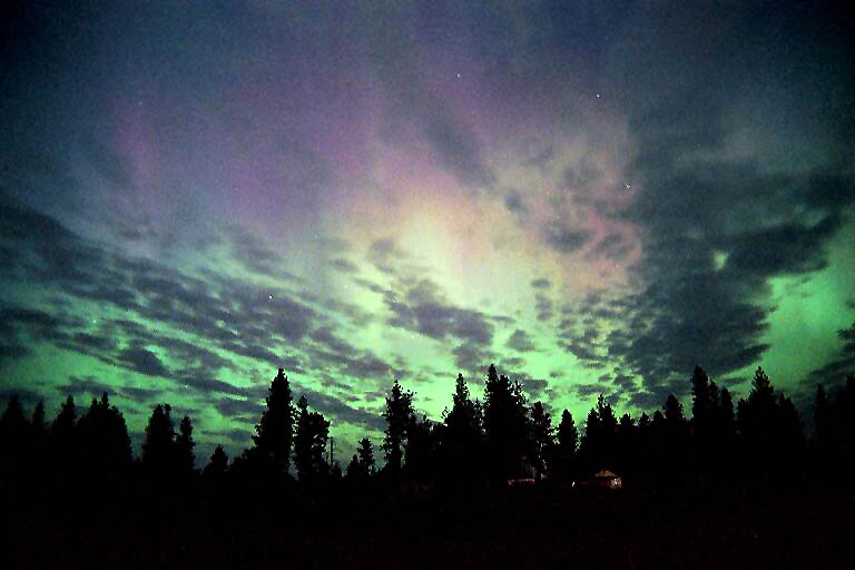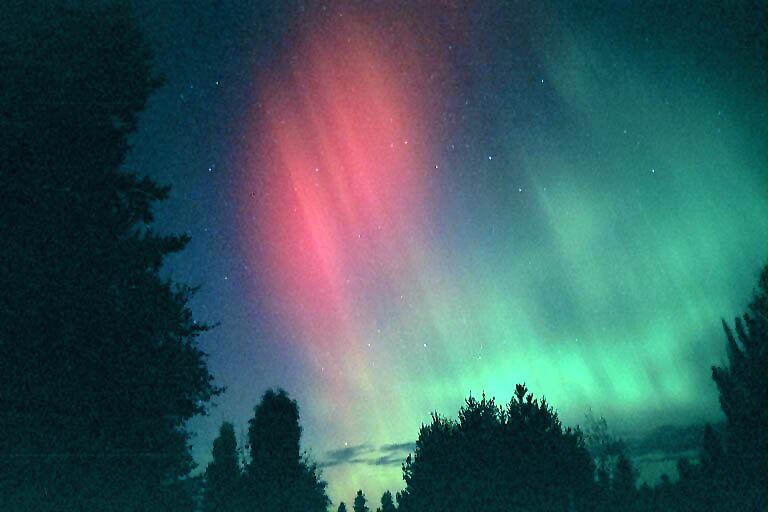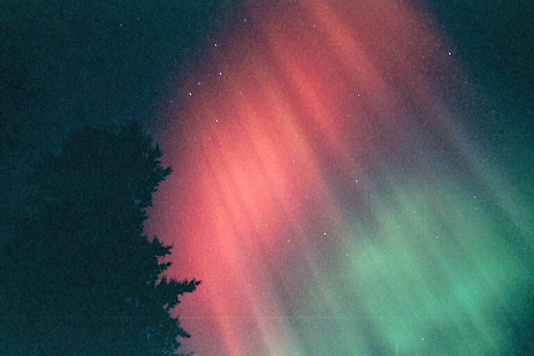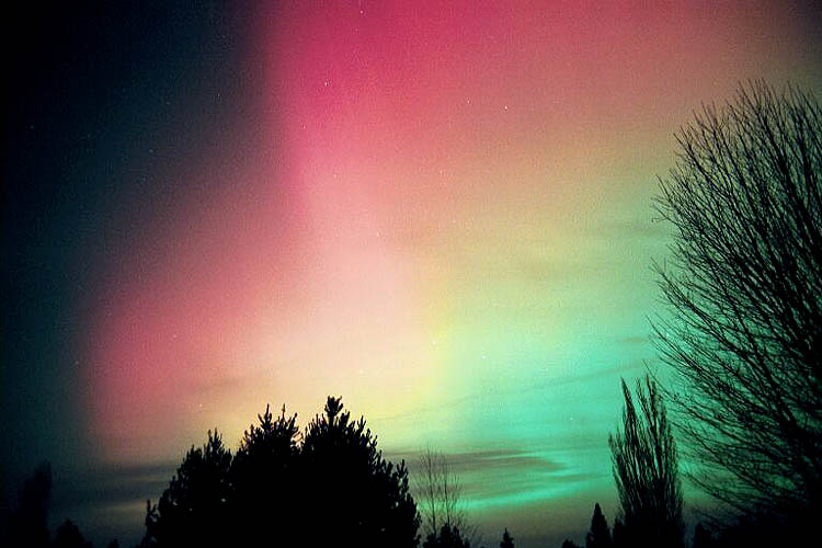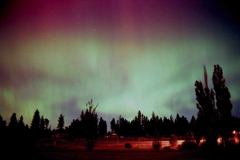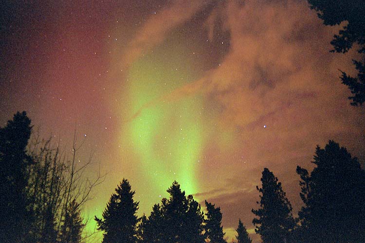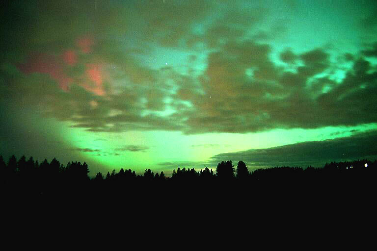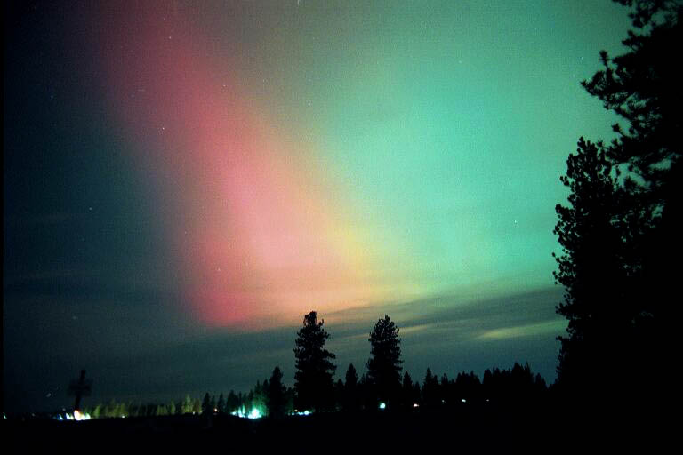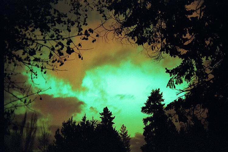 11-24-01-001.jpg (68734 bytes)A window through the trees and clouds showed the intense aurora activity on November 24th, 2001, over eastern Washington. The clouds glowed with an orange tint from the light show above them.