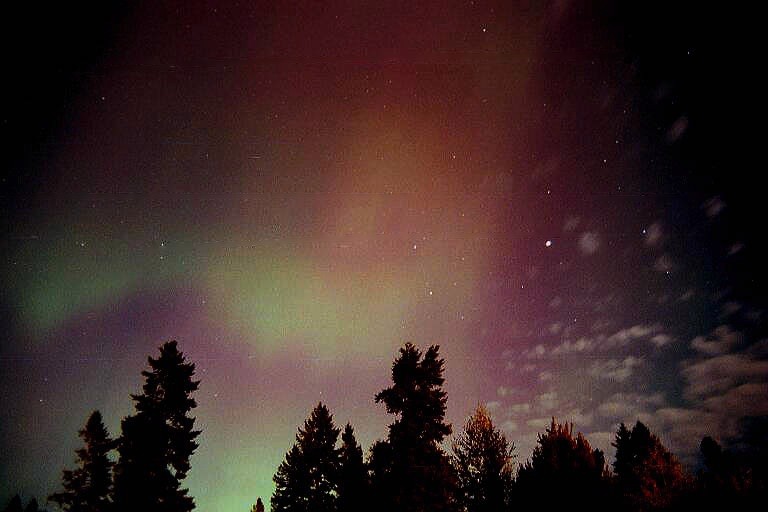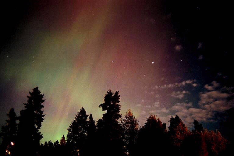 10-28-01-05.jpg (51142 bytes) The clouds moved over quickly once they began to break and the aurora wasted no time in filling the sky with color as the rain moved on. This was a 15 second shot on Kodak Royal Gold 400 with a 28mm lens at F 2.8
