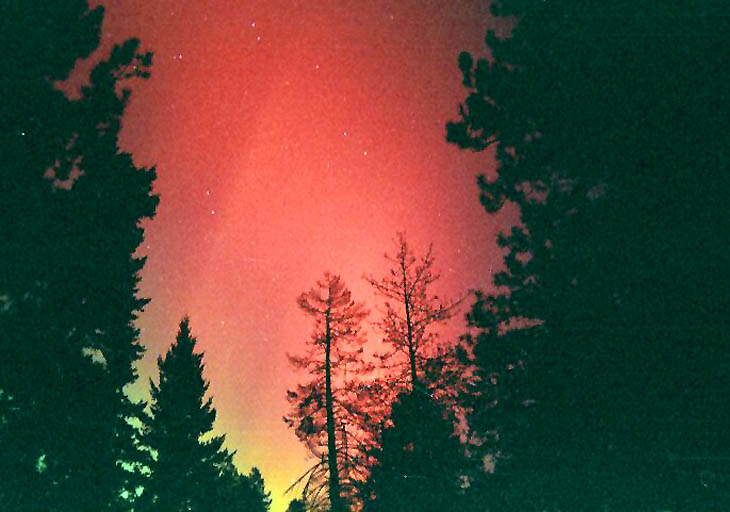 April 6-2000- copy.jpg (62752 bytes)   The night of April 6th 2000 brought record setting cold temperatures to the Inland Northwest in spite of the burning skies overhead. The night produced most intense reds I have ever seen were caught in this 20 second shot on Kodak Royal Gold 400 film.