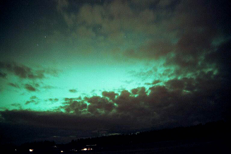 4-19-02-007.jpg (59301 bytes) I live about 15 miles north of a city of 300,000 people. My skies to the north are dark enough for photographing auroras, but not for deep space shots. This is what I see when looking SW toward the city. The clouds are lit by thousands of unshielded lights and a lot of wasted electricity and the Milky Way is gone forever