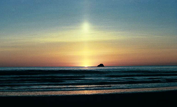 11-25-02-012.jpg (44096 bytes)Sun pillar over the bay at Crescent City, California on November 25th, 2002. This was a wide angle shot was taken with a 28 mm lens. The pillar moved slowly past the rock to the right as sunset progressed, and created a mock sun above. 6-17-03-008.jpg (26680 bytes)The evening began with an arc forming from west to east directly overhead which looked like a wide glowing contrail. I quickly set up and began shooting. Unfortunately, the lens was set at f 22 and I didn't notice until the arc was fading.  And so it goes....  6-17-03