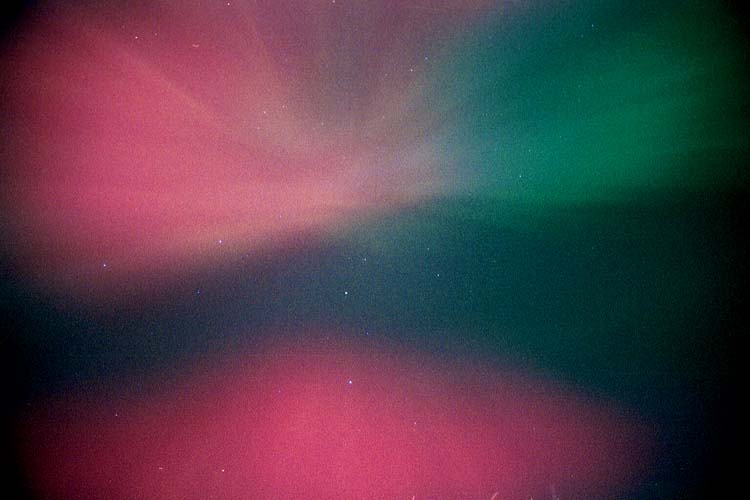 10-28-01-06.jpg (44405 bytes)Around 3am, pillars of color rose from three directions and began to merge over head. This shot was taken looking almost straight up. 15 second exposure on Kodak Royal Gold 400