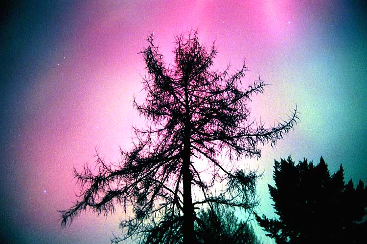 3-30-01-014 copy.jpg (87217 bytes) Looking up our favorite Tamarack tree, I captured this beautiful pink color in a 25 second exposure