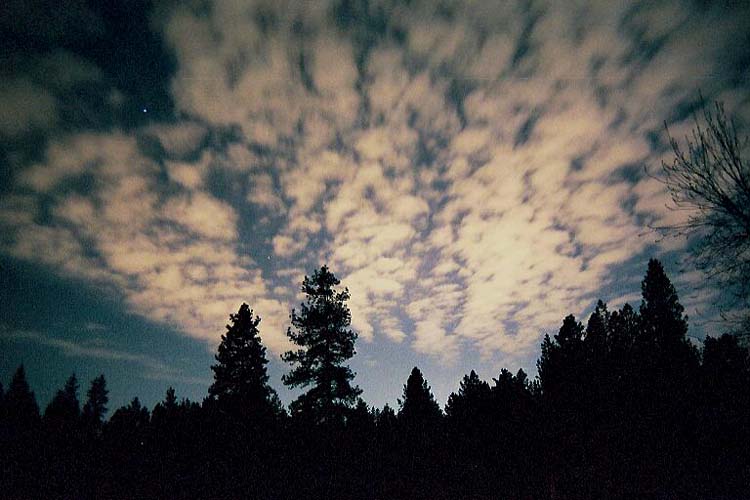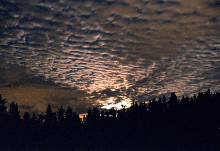 Table 2000-071 copy.jpg (46269 bytes)My 17 inch telescope "The Blue Moon" is silhouetted by the Northern Lights at the Table Mt. Star Party in the Cascade Mountains near Ellensberg Wa. Two nights with aurora were an added bonus to the 1400 people at TMSP in July 2000         Moonrise copy.jpg (66886 bytes)A full moon rising under "alto cumulus." clouds in June of  2000. Taken from my house on Peone Prairie.
