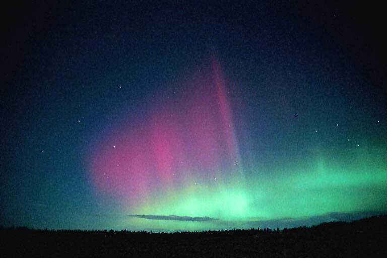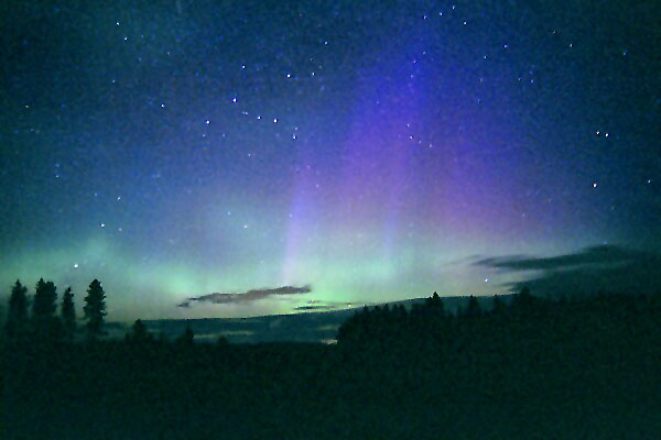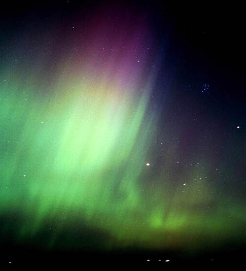 9-3-02-04.jpg (70566 bytes)This display appeared mostly green to the eye with faint reds and purple. But this 25 second shot caught many more subtle colors in the aurora. Taken with a Minolta X 700 camera and 28mm lens. Sept. 3rd, 2002.