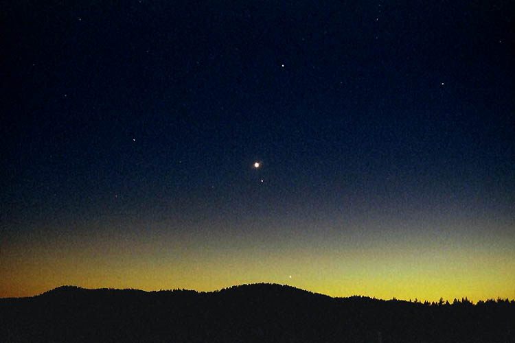 5-11-02-007 copy.jpg (40264 bytes) Sunset over the foot hills of the Selkirk mountains on May 12th, 2002. Venus is at the center. Mars is just below it and Saturn can be see just above the hilltop. 10 sec exposure at F 4.5 at 150mm.