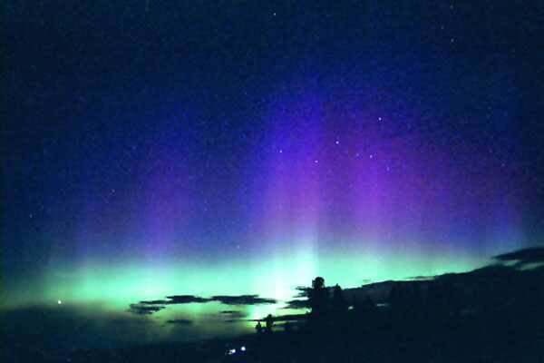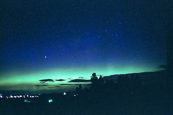 Peone-016 copy.jpg (28098 bytes).Jupiter, Saturn, Taurus and the Pleiades star cluster shine through the edge of brilliant aurora over the Mt. Spokane foothills.