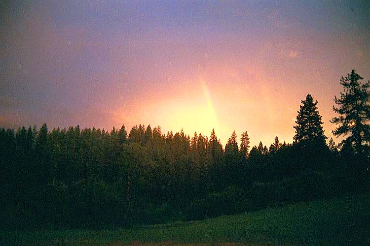 7-2001rainbow008.jpg (62423 bytes) The rainbow faded into a burst of flaming sky in the SW as the sun set. July, 2001
