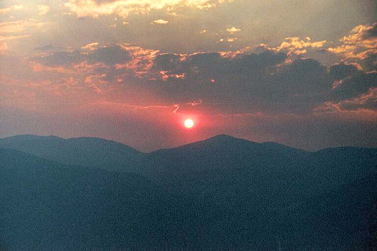 8-19-01pict12.jpg (58497 bytes) Large forest fires burning in central Washington filled the Kettle Crest mountains with smoke 150 miles away. The sun can barely be seen through the smoky haze in this shot taken from the top of First Thought Mountain near the Canadian boarder.