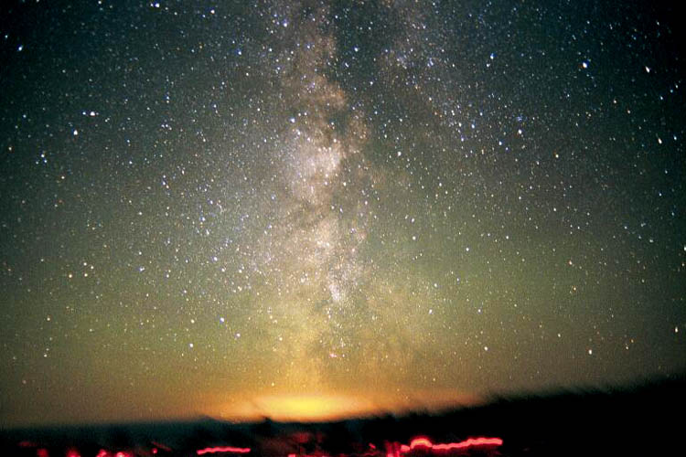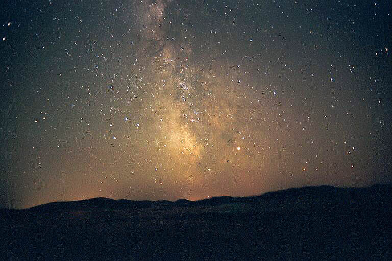 table2001-036.jpg (73158 bytes) The Sagittarius region of the Milky Way setting into the sky glow from Yakima Washington 50 miles away. This was a 10 minute guided shot taken on Fuji 800 film using a 28mm lens at F2.8.