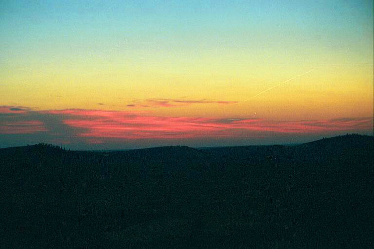 9-15-01pict22.jpg (67081 bytes)As the sun set behind a distant cloud bank, the sky became a rainbow of color for a brief moment. Taken from Star Butte in the Palouse farm lands of Eastern Washington.