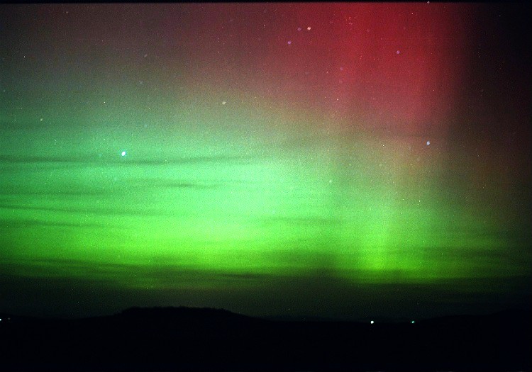 10-1-01-006.jpg (46439 bytes)The sky glowed all night but little could be seen because of the nearly full moon until this 30 minute burst over powered the moon light. For a few minutes the NW sky became a wall of red.