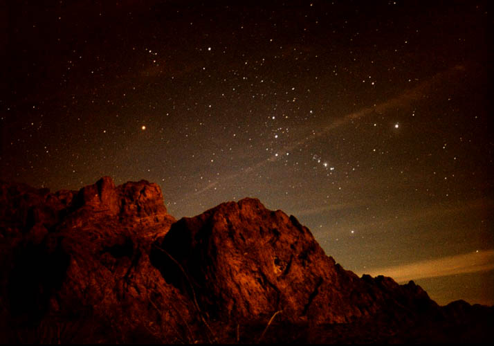 Desert sky copy.jpg (47835 bytes) Orion rising over the Kofa Mountains in SW Arizona. A first quarter moon was setting in the west and light up the mountain sides in this 30 second exposure.
