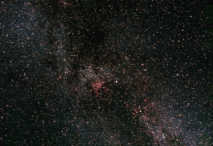 N.A. nebula  copy.jpg (127805 bytes)The North America Nebula lies in the center in this shot of the Cygnus region of the Milky Way. This 5 minute guided exposure was shot with a 28 mm 2.8 lens on Kodak 800 film from Sky Valley in Southern California.