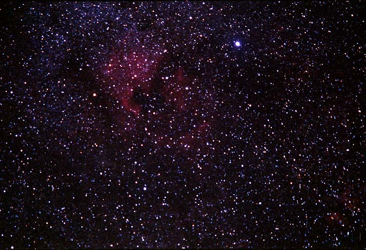 N. Ameriana neb-b- copy.jpg (104132 bytes)North American nebula in the constellation of Cygnus shot with a 200 mm F 4.5 lens on Kodak 800 film. This was a ten minute guided exposure taken in southern Arizona.