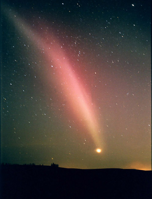 An intense auroral display in April 1999 produced this arc that rose from the eastern horizon and stretched overhead to merge  with Venus setting in the west. The arc lasted for several minutes turning Venus into the comet of the century.