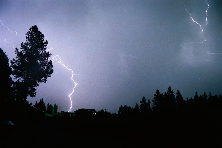 lightning07.jpg (43191 bytes)A summer thunder storm gave me the chance to finally catch a lightning bolt of film. It's harder than you might think at first, and the pouring rain and wind didn't help any. Taken in June, 2002 with a Minolta X700 camera and Kodak 400 film.