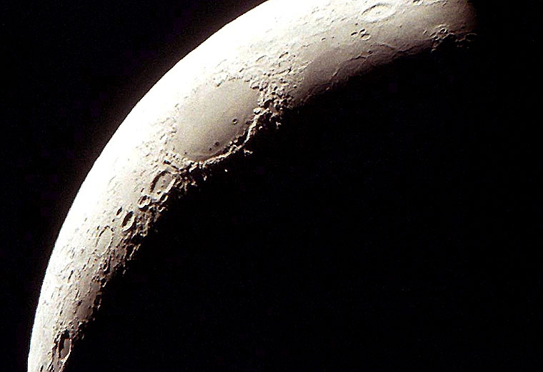 moon 2-b.jpg (139998 bytes)Crescent moon shot through a 10" F 4.5 reflector at 50 power with a 50 mm lens on a tripod. Taken in Southwest Arizona in January 2000.