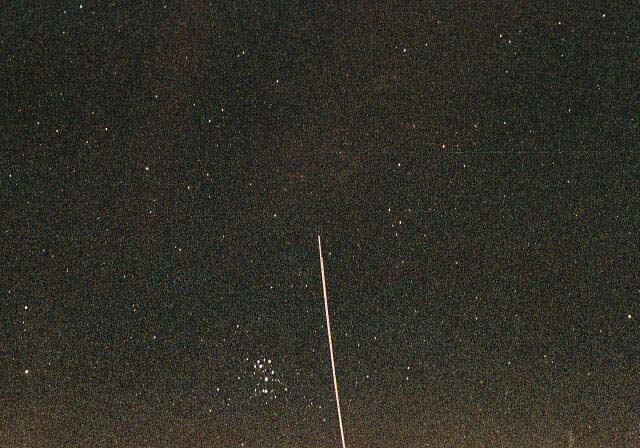 table2001-037.jpg (74293 bytes)Atlantis and the space station Freedom fly past the Pleiades cluster late on the final night of the star party at TMSP 2001. They were separated by a few degrees after the recent undocking, but show as a bright streak in this 7 second exposure