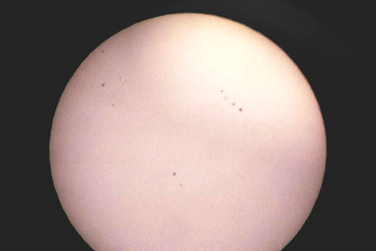 table2001sunspots.jpg (30458 bytes) Sunspots on July 21, 2001 Taken through a 17" telescope at 60 power using Badar solar filters. The camera was focused at the eyepiece of the telescope while mounted on a tripod and auto exposed.